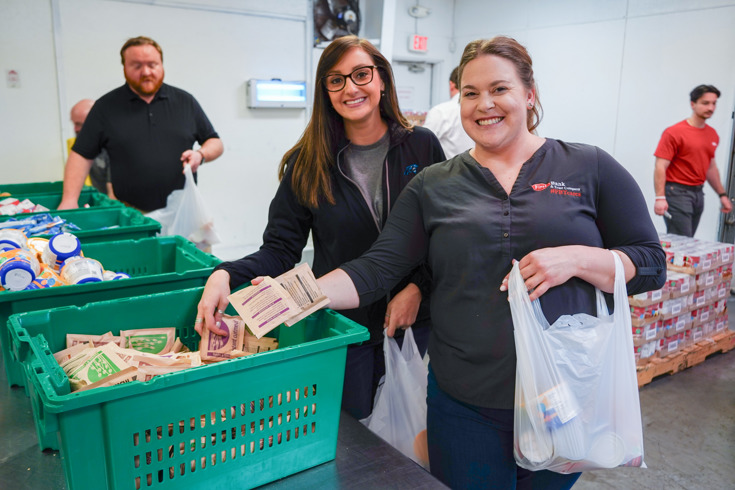 Caption: Hannah Ford and Samantha Mitchell preparing to fill backpacks at Feeding Southwest Virginia