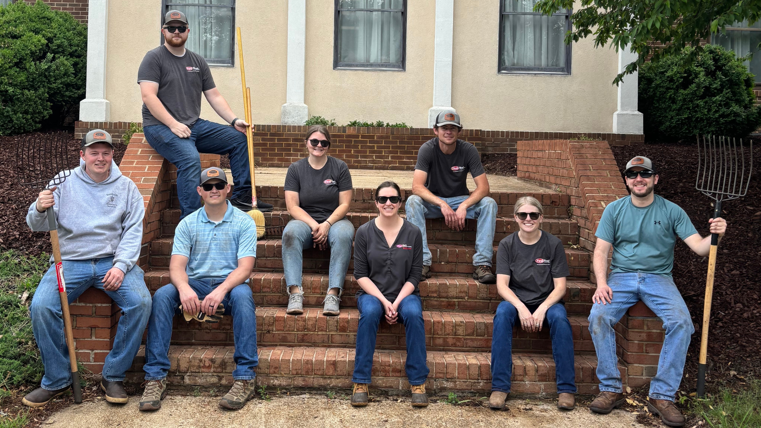 Caption: A group of Young Bankers helps with landscaping at the Shenandoah Community Library.